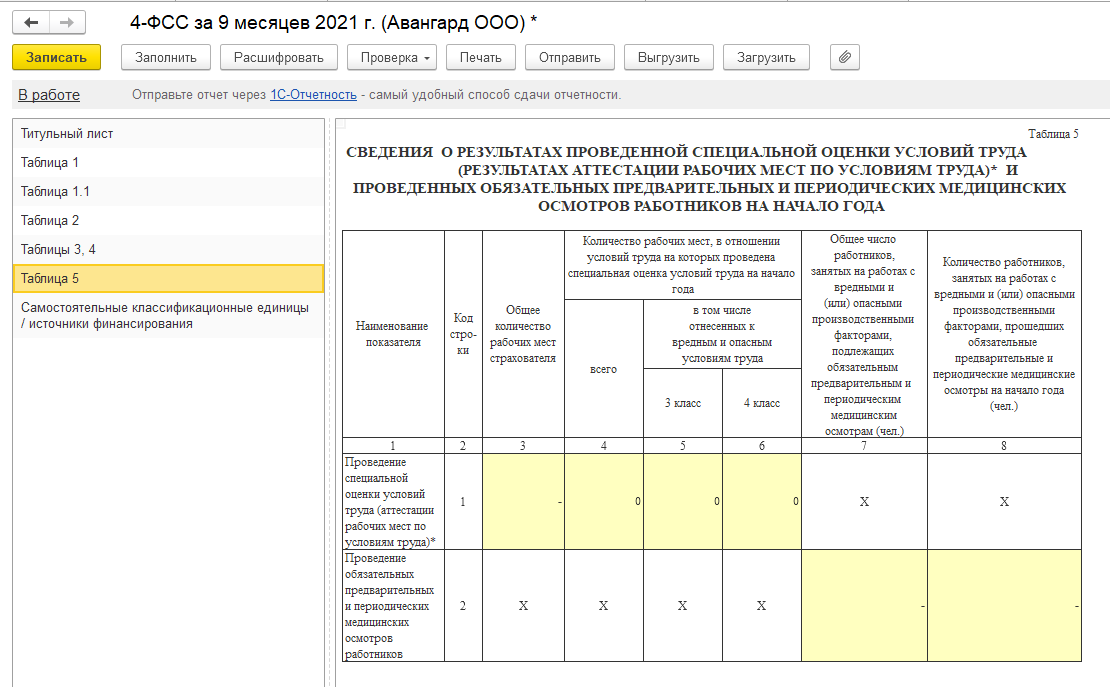 Результаты проведенной СОУТ нужно указать вручную в таблице 5 отчета 4-ФСС. Здесь же требуется внести информацию о проведенных обязательных медосмотрах работников (предварительных и периодических) на начало отчетного года.