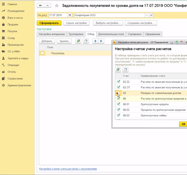 По умолчанию сумма дебиторской задолженности уменьшается на сумму резервов. Поэтому сумма задолженности в отчете, может не совпадать с сальдо по счету 62.01. Можно изменить порядок расчета для определения задолженности покупателей. Перейдем на закладку отбор. Настройка счетов учета расчета с покупателями. Исключаем счет 63 (резервы по сомнительным долгам), чтобы сумма дебиторской задолженности не уменьшалась на сумму резервов.