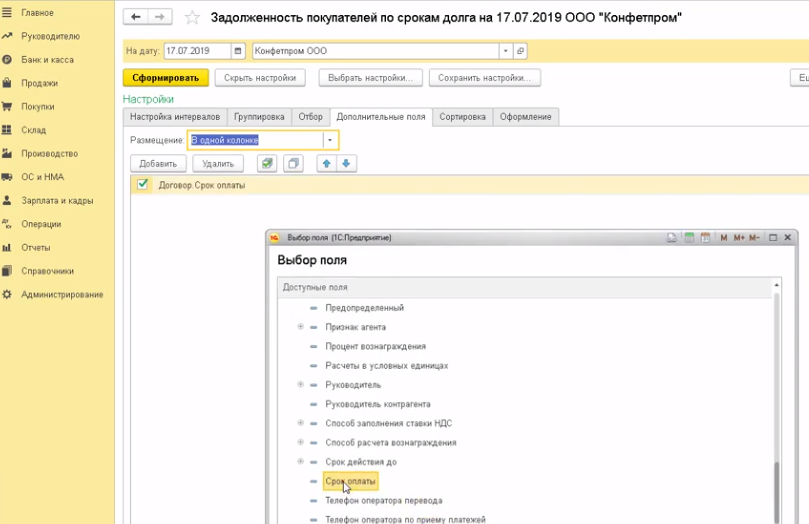 Если мы хотим в явном виде выводить срок оплаты по договору, то этот реквизит нужно указать на закладке дополнительные поля.