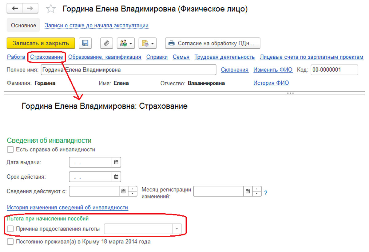 В блоке «Страхование» (раздел карточки физического лица) есть возможность увеличить размер уплаты пособия, если на то есть причины. Их следует прописать, чтоб получить прибавку.