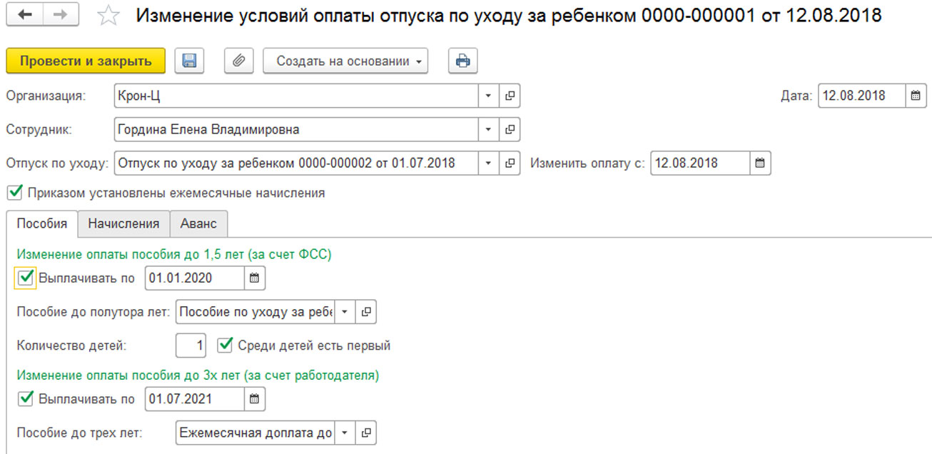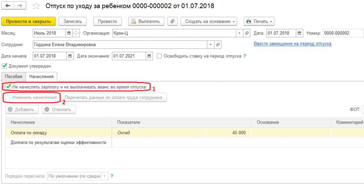Отпуск по уходу за ребенком в 1С
