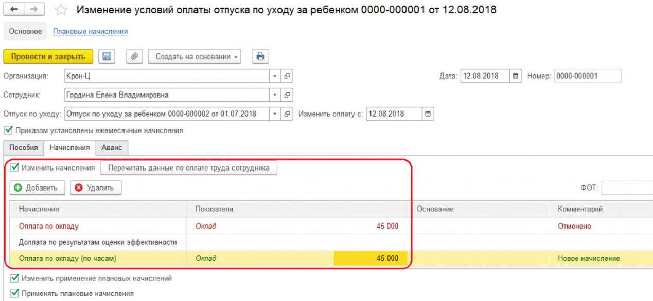• В случае, когда сотрудник продолжает выполнять рабочие обязанности, в документе следует поменять начисления, нажав на специальную кнопку (Рис. 12, п.2).