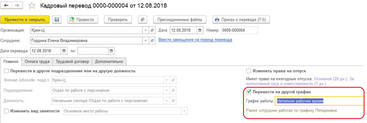 С помощью кадрового документа вносим изменения по графику работу.