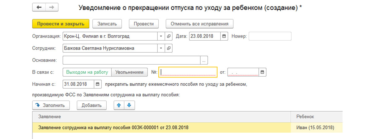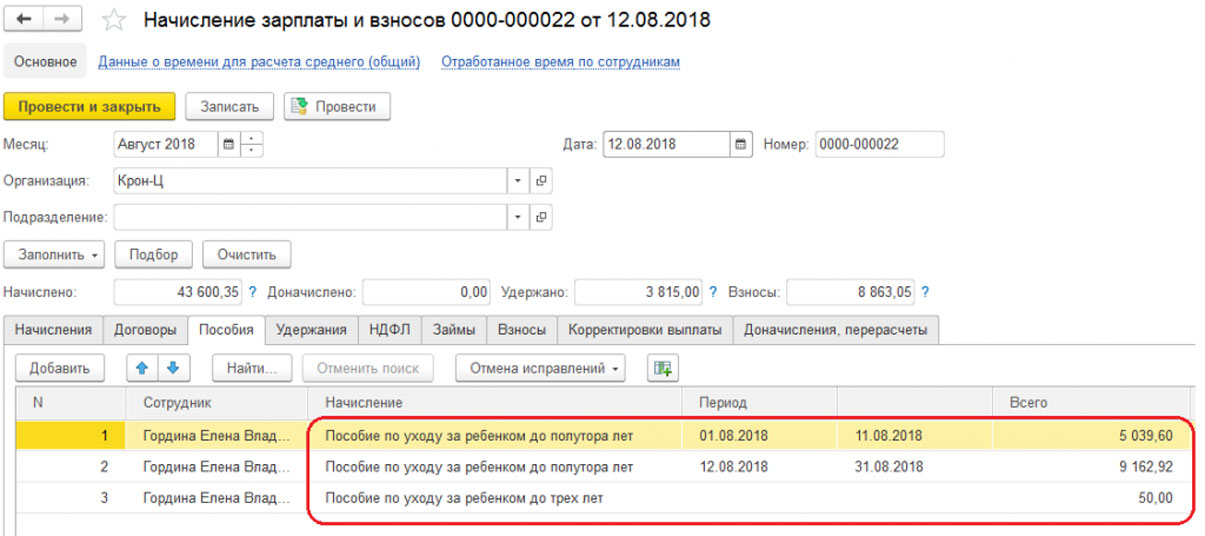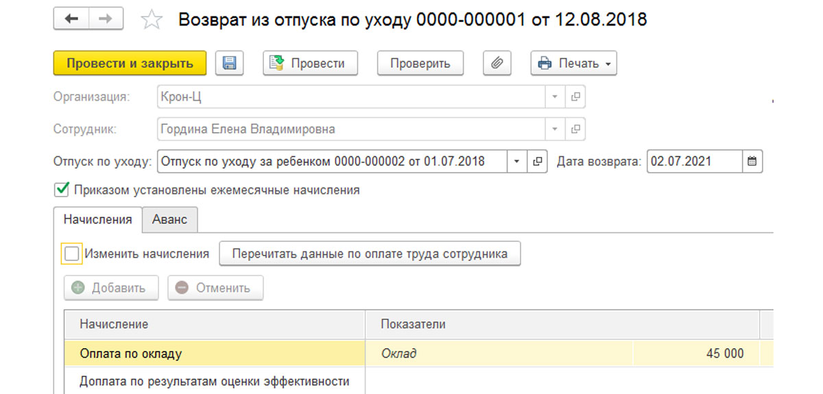 В документе «Возврат из отпуска по уходу за ребенком» можно увидеть остановку начисления всех пособий, которые были внесены первоначально. Этим документом возвращаются основные начисления сотрудника.