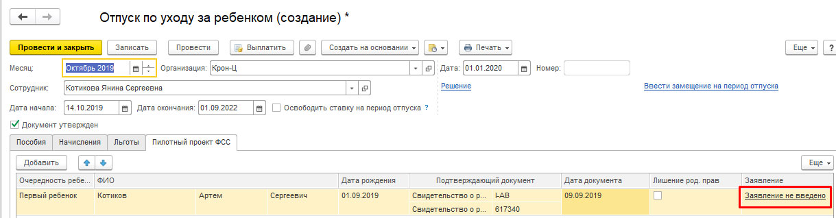 Так, выплаты формируются во вкладке «Отпуск по уходу за ребенком» до достижения ребенком возраста 1,5 года. Добавочная вкладка «Пилотный проект ФСС» возникает при превышении участия в проекте над датой окончания пособия, где указываются сведенья ребенка.