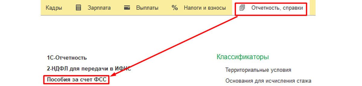 Затем следует нажать на меню и перейти во вкладку «Отчетность, справки-пособия за счет ФСС».
