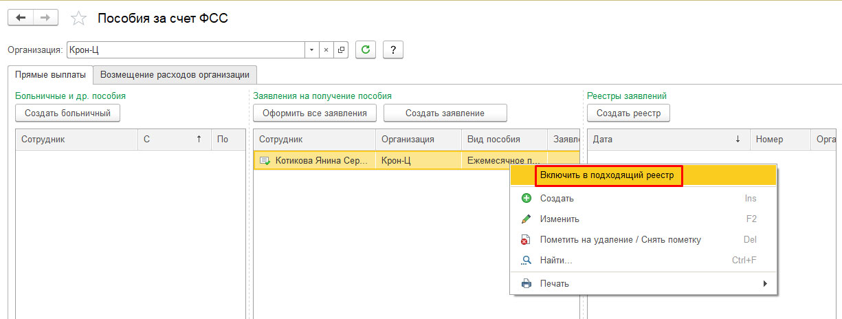 Далее создадим реестр заявлений работников для получения файла выгрузки с последующей его подачей в ФСС.