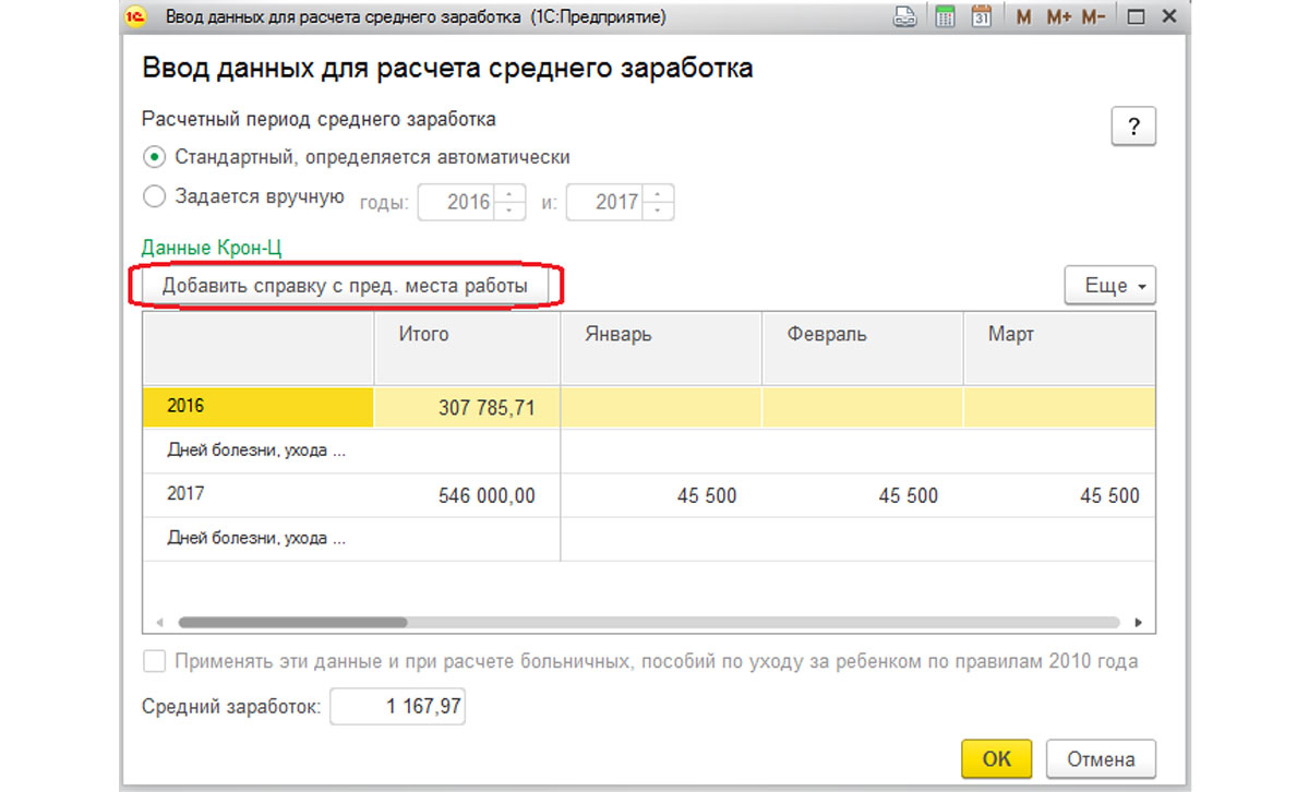 Далее вносятся данные для «Справки с предыдущего места работы», которые можно заполнить путем их создания в строке «Средний заработок».