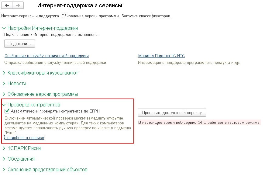 Когда указывается ИНН, программа может автоматически провести его сверку с информацией из базы ФНС. Для использования такой возможности нужно поставить флажок "Автоматически проверять контрагентов по ЕГРН" в разделе "Проверка контрагентов". Это делается через раздел "Администрирование", далее "Интернет-поддержка и сервисы". При проведении проверки будет указан статус, есть контрагент в базе ФНС или нет.