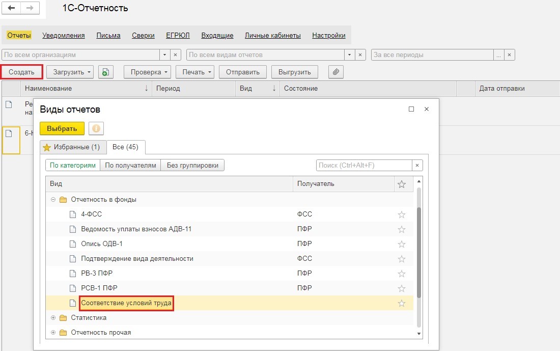 Если используется 1С:Бухгалтерия, то нужно зайти в раздел "Отчеты", а если 1С:ЗУП - в раздел "Отчетность, справки". Далее выбирается пункт "Регламентированные отчеты" либо "1С-Отчетность". Откроется окно, в котором пользователь нажимает кнопку "Создать" и выбирает необходимый отчет - "Соответствие условий труда".