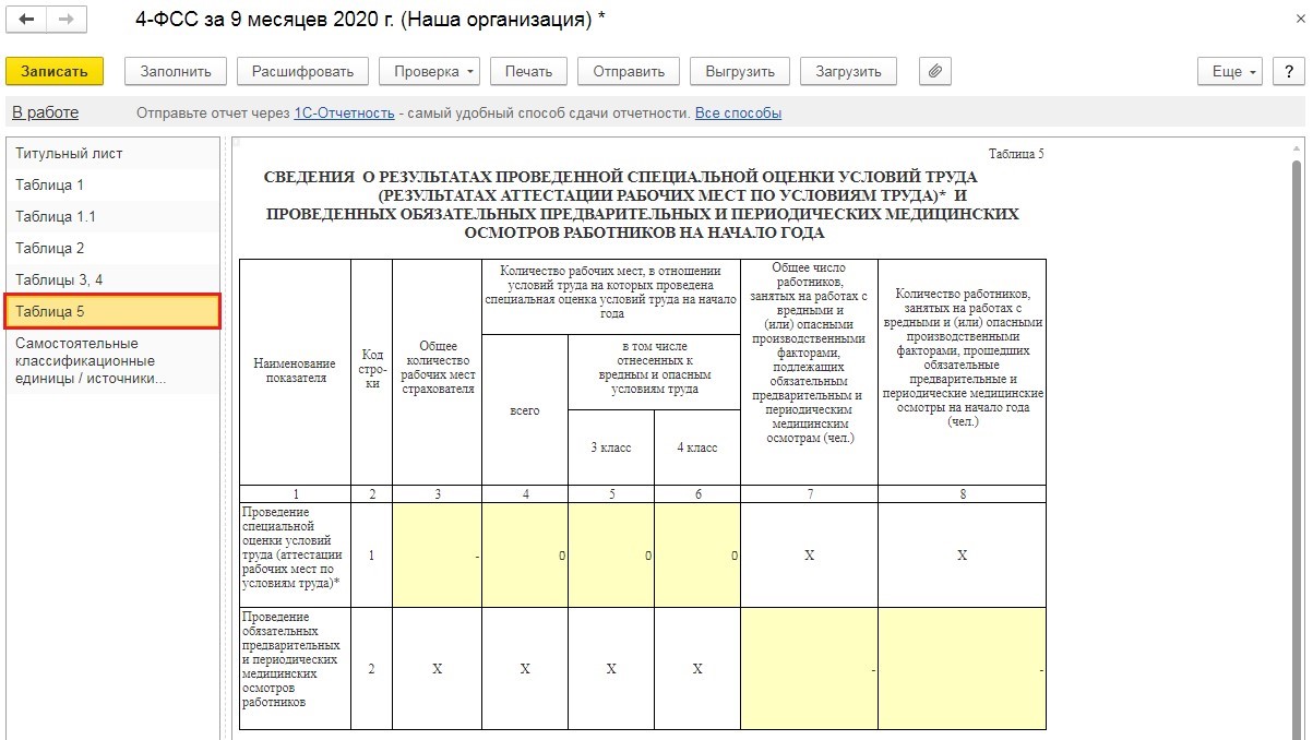 Эта отчетная форма заполняется автоматически при нажатии кнопки "Заполнить". Единственное - разд. 5 нужно заполнить вручную, поскольку именно в нем отражается информация по результатам СОУТ.