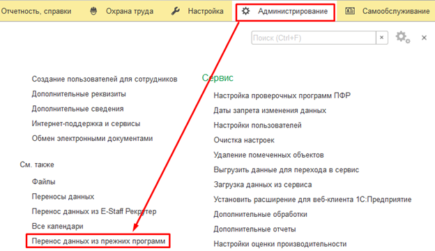 Для того, чтобы перенести данные из ЗУП 2.5 и ЗИК 7.7 можно воспользоваться специальной функцией, называемой "Перенос данных из прежних программ". Ее запуск осуществляется из подменю "Администрирование".