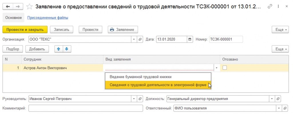 В системе «1С:Предприятие 8» есть заявление сотрудника о выборе способа получения сведений о трудовой деятельности. Детальнее о сроках его поддержки сказано в «Мониторинге изменений законодательства».