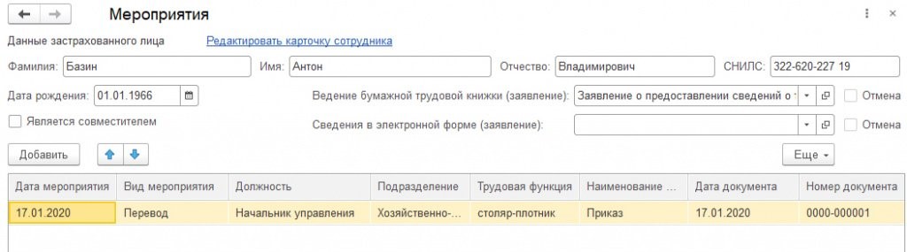 Кадровые документы, которые должны быть отражены в трудовой, указаны как «Мероприятия» – смотрите следующее изображение.
