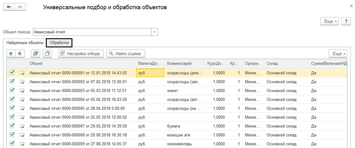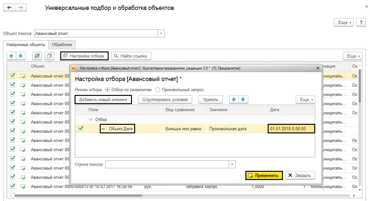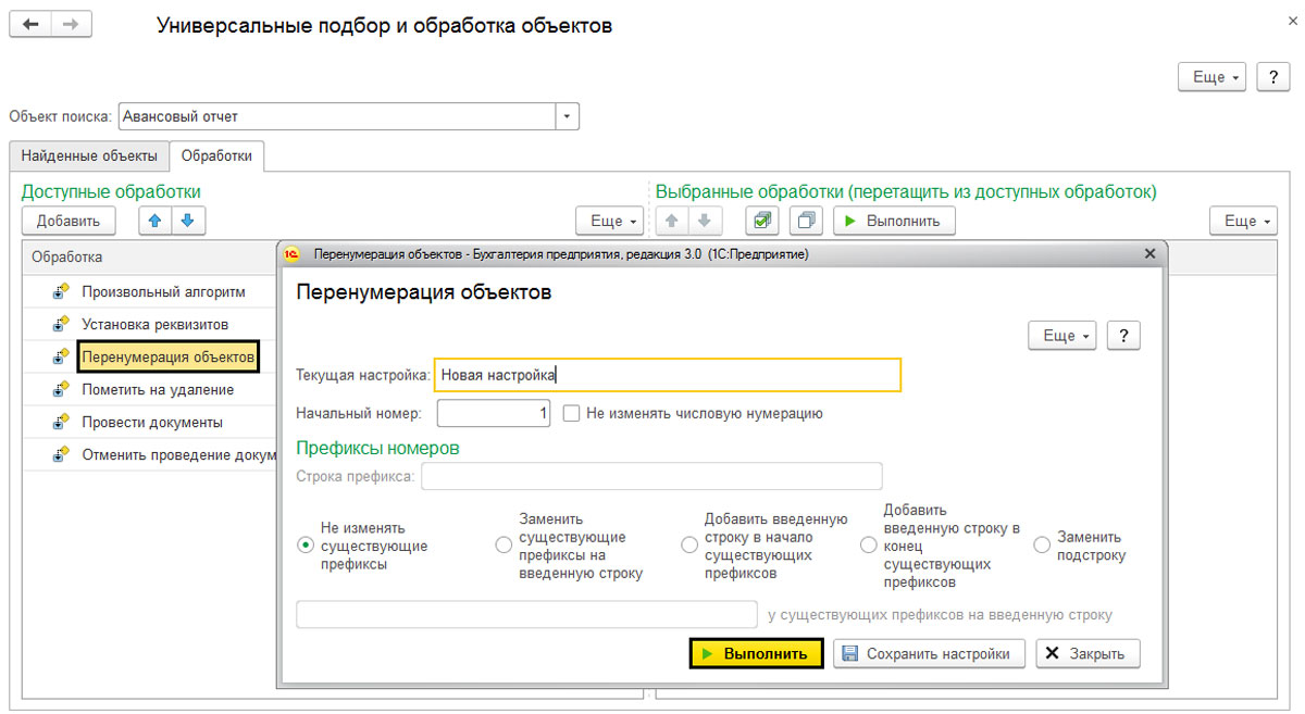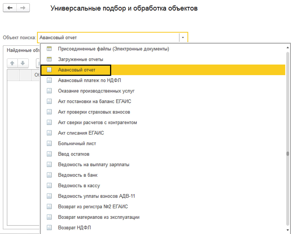 Перед вами появится поле "Объект поиска". Выберите тип документа, который требуется перенумеровать. В примере был взят "Авансовый отчет". Такая обработка доступна также для элементов справочников.
