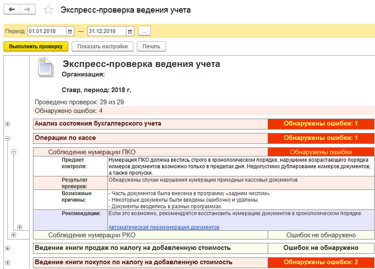 Здесь следует нажать на "Показать настройки". Можно выбрать подходящие разделы для проверки. В нашем примере разбирается, как соблюдается нумерация в РКО или ПКО в разделе "Операции по кассе". Кроме того, в "Ведении книги продаж по НДС" следует выбрать "Соблюдение нумерации счетов-фактур". Далее необходимо нажать на кнопку "Выполнить проверку".