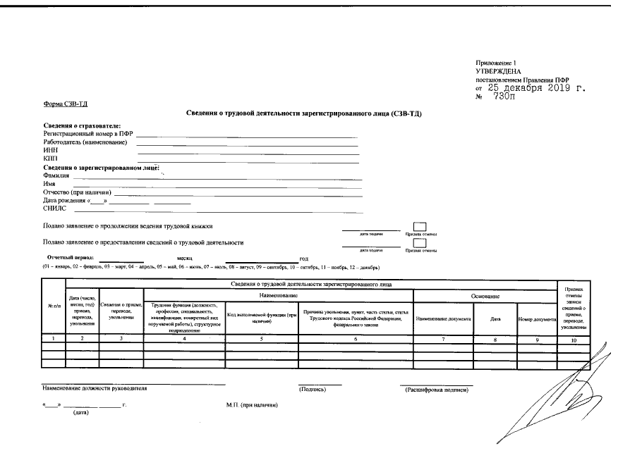 На официальном интернет-портале правовой информации размещено Постановление Правления ПФР от 25.12.2019 г. № 730п. На основании данного нормативно-правового акта вводится в действие форма СЗВ-ТД, отражающая сведения о трудовой деятельности работников.