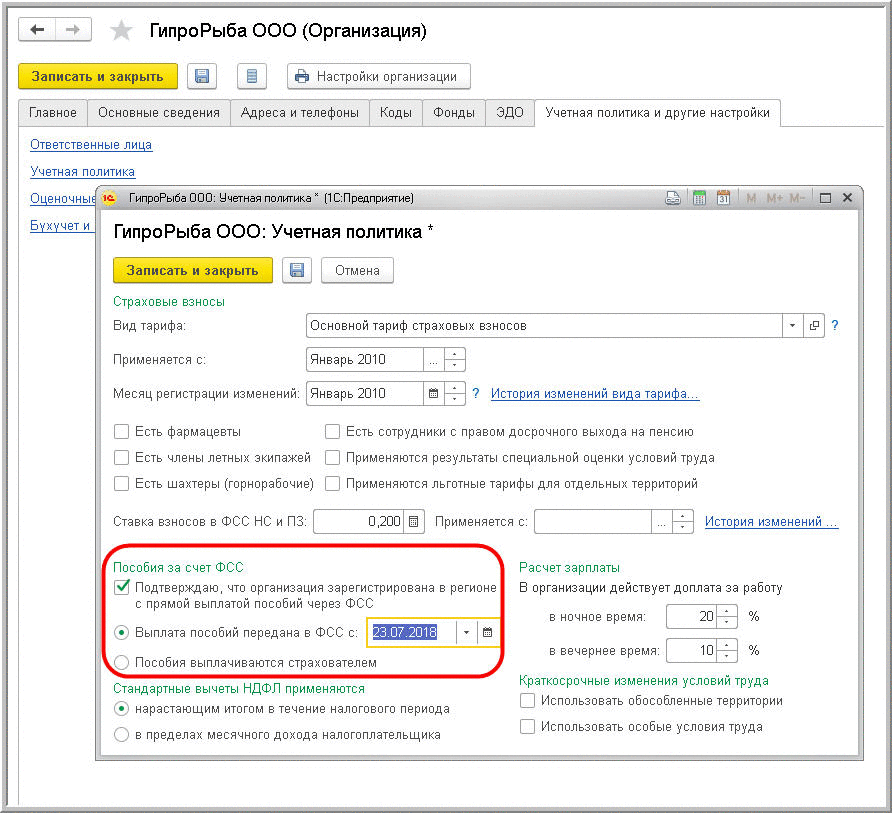 Чтобы применять все возможности работы с ФСС в программе в настройках Реквизитов организации (перейти туда можно через меню Настройки) на строке Учетная политика и другие настройки по кнопке Учетная политика требуется кликнуть флаг Подтверждаю, что организация зарегистрирована в регионе с прямой выплатой пособий через ФСС и ввести число, начиная с которого Выплата пособий передана в ФСС.
