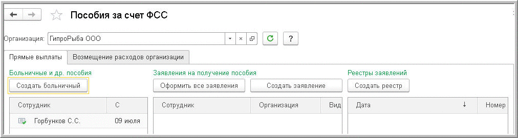 Рабочее место для облегчения оборота документов с ФСС по прямым начислениям