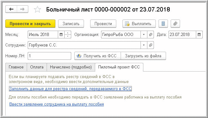 Нажав по клавише Создать больничный лист, вы увидите новый документ, содержащий закладку Пилотный проект ФСС.