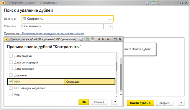 Удобнее всего искать дубли через другие реквизиты, нежели имя. Например, для справочника «Контрагенты» чаще всего используют ИНН и КПП, а для «Номенклатуры» используют артикул.