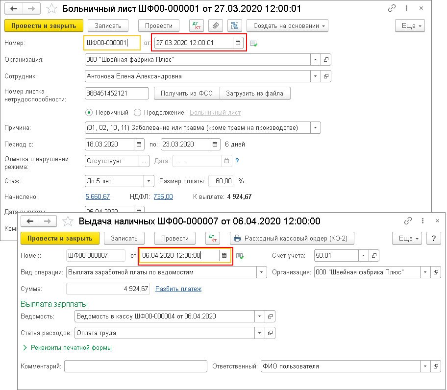 День удержания налога - дата выплаты дохода. В 1С день фактического получения дохода изначально указывается в разделе Больничный лист. Далее дата уточняется в автоматическом порядке (это происходит при оформлении документов на выплату). Так сделано из-за случаев, в которых фактическое число выплаты начислений различается с запланированной до этого в документе датой для того чтобы пользователю не нужно было возвращаться в документ начисления и уточнять день выплаты. Иными словами, настоящая дата фактического получения дохода (дата для строки 100) является числом документа на выплату (рис. 1).