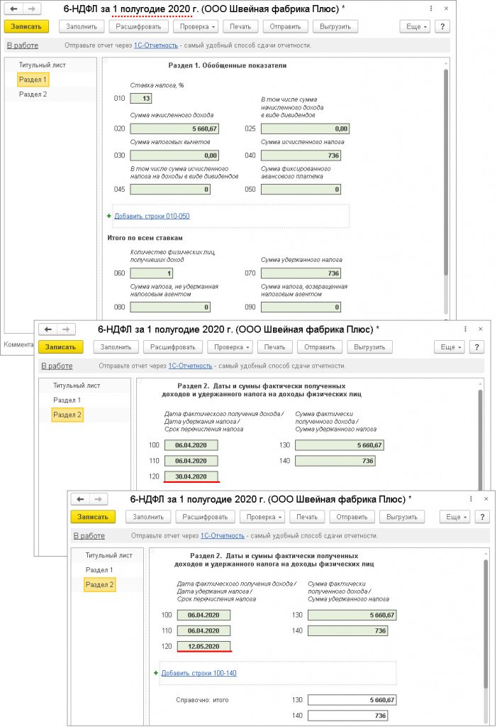 Если предприятие не вело деятельность во время нерабочего периода, сумма пособия будет отображена в разделе 1 и в разделе 2 подсчета за полугодие настоящего года. Однако период перечисления НДФЛ с суммы пособия - 12 мая (рис. 2).