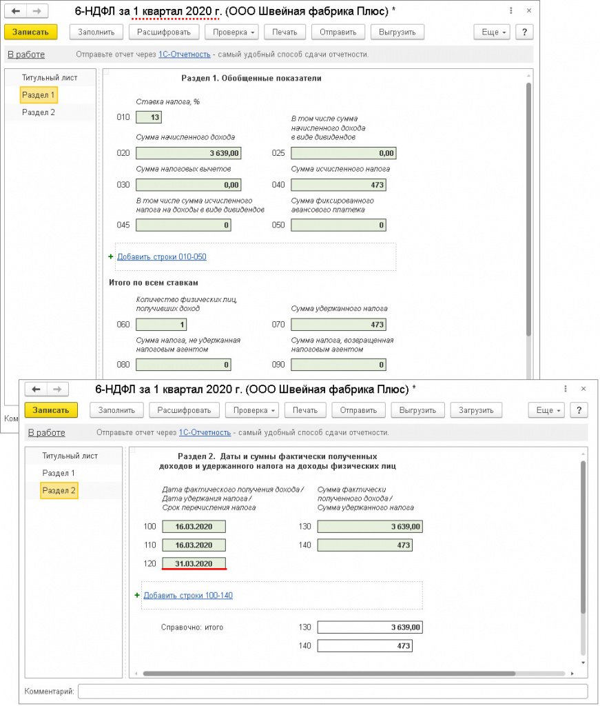 Если предприятие функционировало во время нерабочих дат, сумма пособия будет отображена в разделе 1 и в разделе 2 подсчета за 1 квартал настоящего года (рис. 3). Период перечисления НДФЛ с суммы пособия - 31 марта.