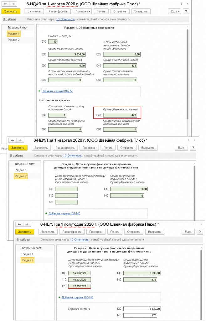 Если предприятие не функционировало во время нерабочих дат, сумма пособия будет отображена в разделе 1 подсчета за 1 квартал текущего года и в разделе 2 подсчета за полугодие настоящего года (рис. 4). В раздел 2 расчета за 1 квартал текущего года сумма пособия не будет причислена, потому как период перечисления налога относится к другому отчетному периоду. Период перечисления НДФЛ с суммы пособия - 12 мая.