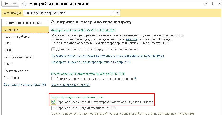 В программе для предприятий, действующих во время нерабочих дней, при установлении последнего срока уплаты налога получится не учитывать нерабочие даты. Для этого в настройке налогов и отчетов должен быть снят флаг Перенести сроки сдачи бухгалтерской отчетности и уплаты налогов (вкладка Главное-Налоги и отчеты-раздел Антикризис) (рис. 5).
