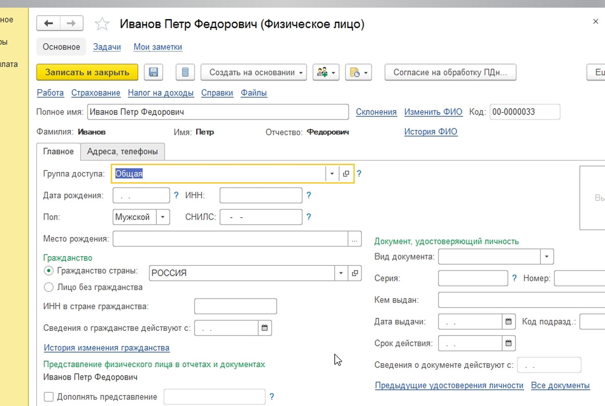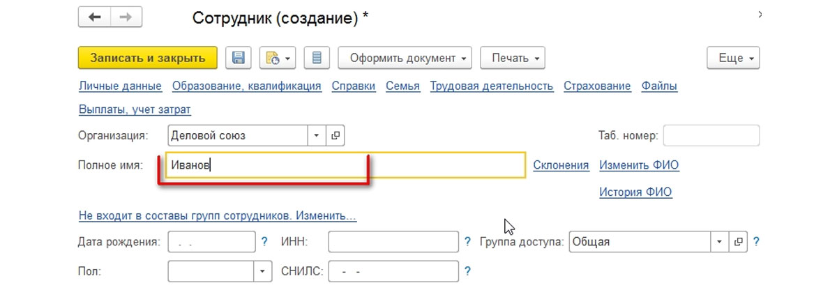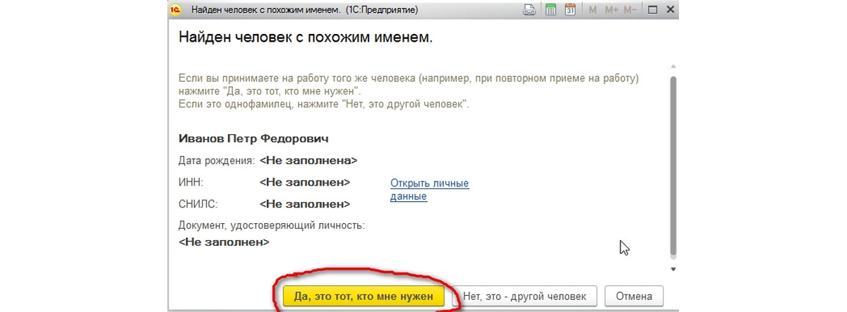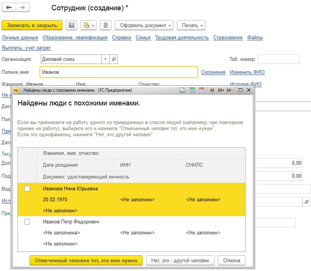 Рассмотрим ситуацию о том, что в информационной базе уже есть сведения о физическом лице, но при создании сотрудника, соответствующего ему сделана ошибка.