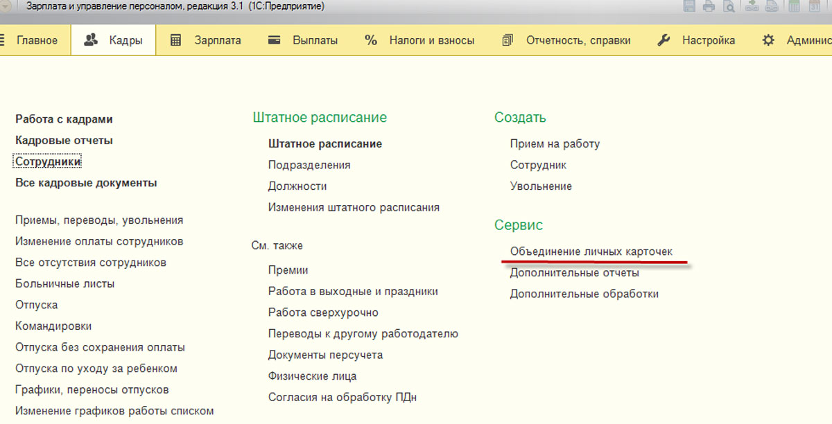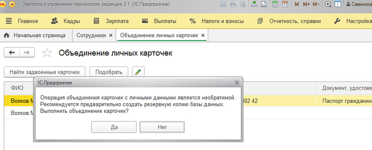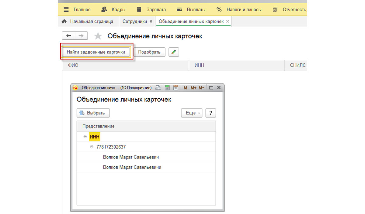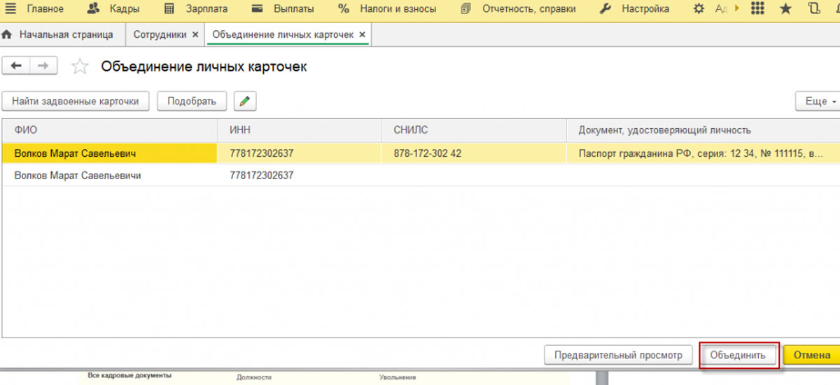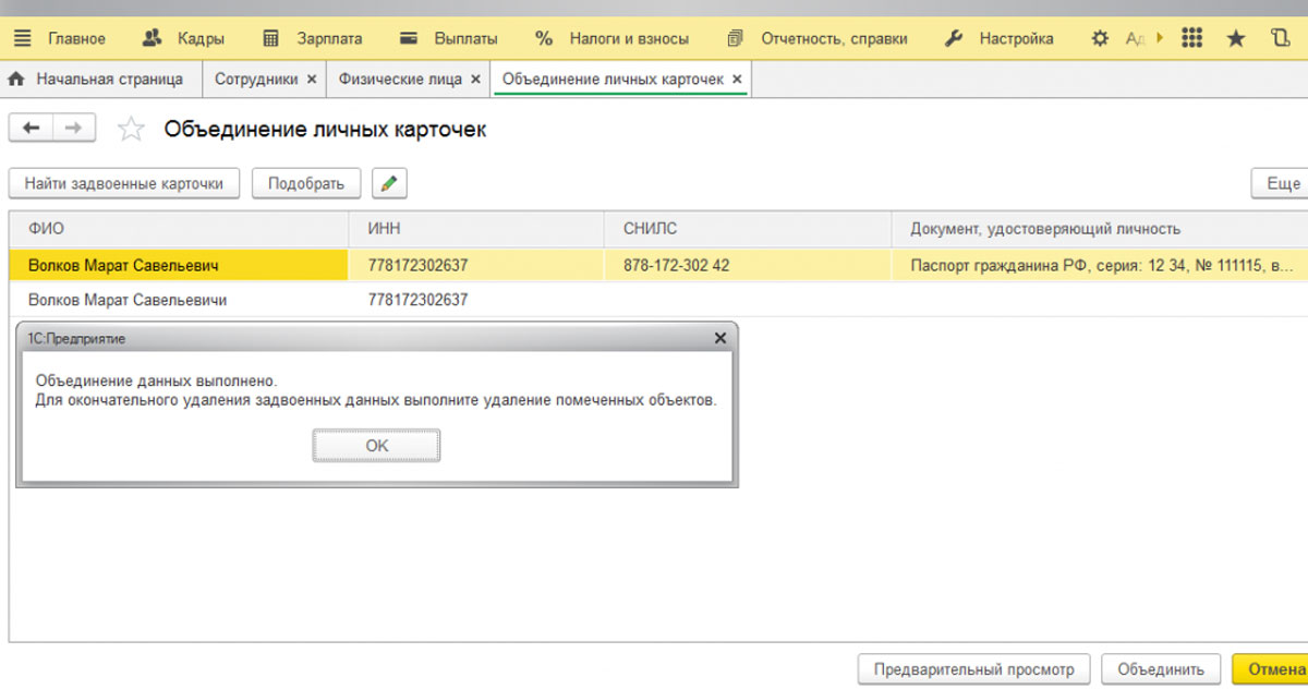 Стоит помнить, что даже если ошибка будет устранена в справочнике «Сотрудники», то в базе физических лиц позиции по-прежнему останется две. Это может привести к ошибкам: заработная плата может быть начислена одному физическому лицу, а аванс и доверенность – выданы другому. Исправить подобную ошибку можно воспользовавшись «Объединение личных карточек», в разделе «Кадры».
