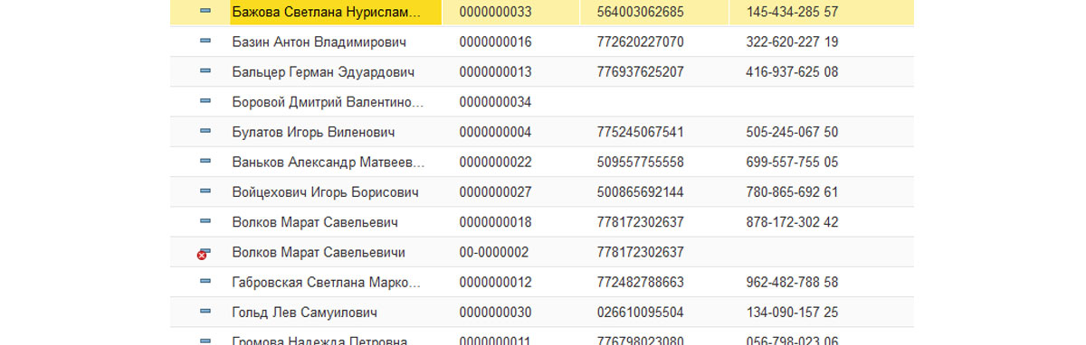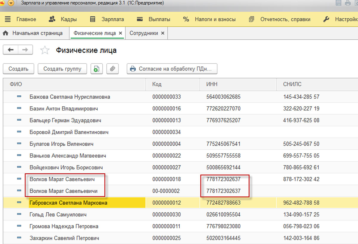 Данный рисунок (Рис.6) подробно отображает результат ошибки, когда в информационную базу было неверно внесено отчество нового работника «Волков Марат Савельевичи». Эта ошибка спровоцировала создание нового физического лица, а выделенные строки в списке отображают сведения об одном и том же работнике. Данный работник не является однофамильцем, так как ИНН одинаковый.