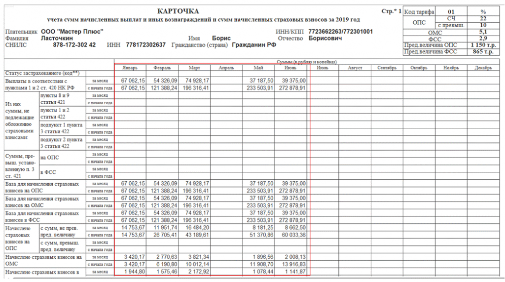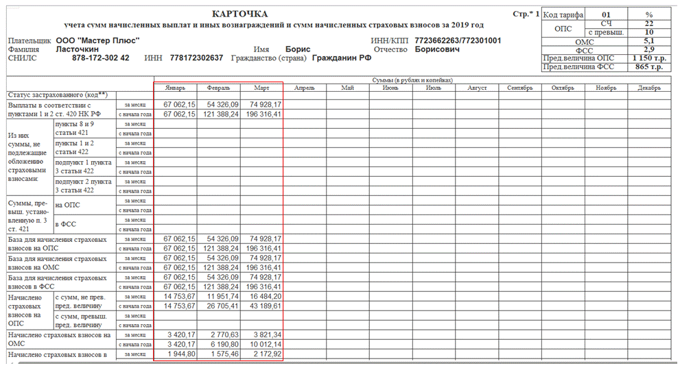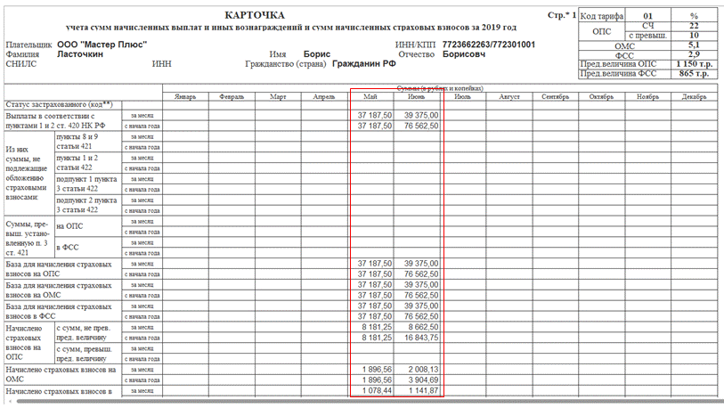 Объединение личных карточек также соединит сведения о размере НДФЛ сотрудника, начислениям, страховым взносам в различные фонды. Чтобы убедиться в правильности отображения этой информации можно сформировать карточку учета взносов по страхованию, используя «Налоги и взносы-Отчеты по налогам и взносам-Карточка учета страховых взносов». ЛК до объединения:
