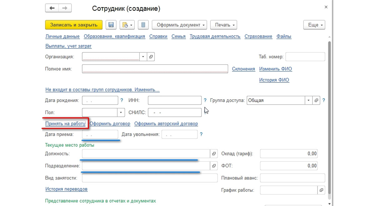 Кроме шапки «Прием на работу» документ имеет три вкладки: