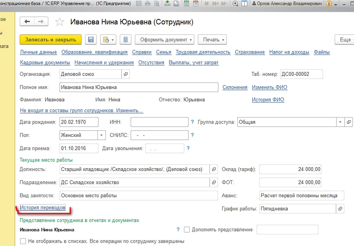 Иногда случается такая ситуация, когда при переносе данных из одной версии программы (например, ЗУП 2.5 в 3.0) нужно посмотреть сведения о «перенесенном» работнике. Сделать это можно воспользовавшись гиперссылкой «История переводов».