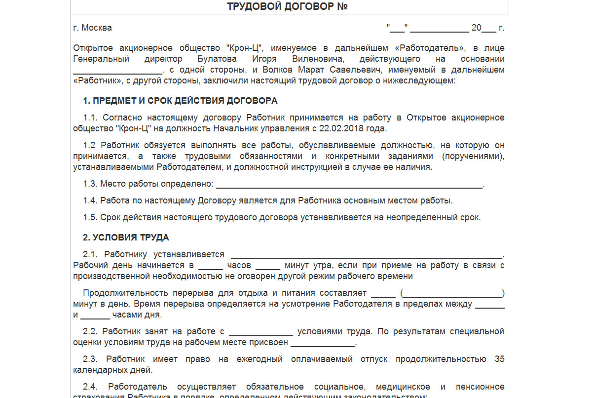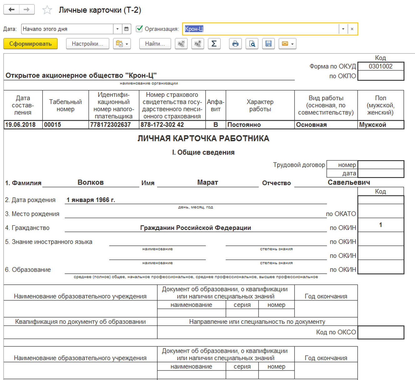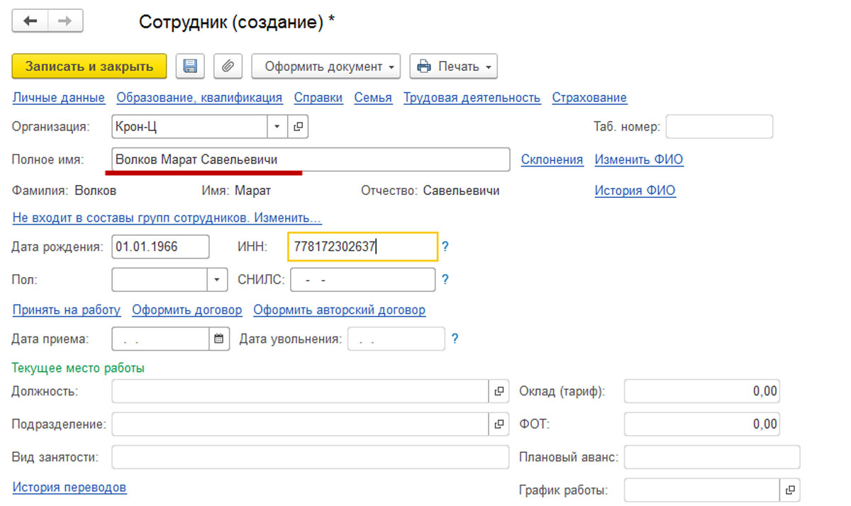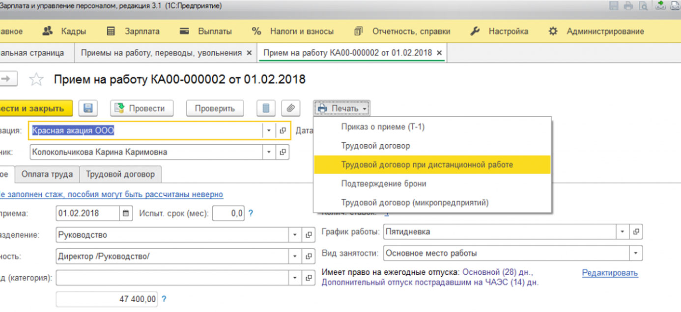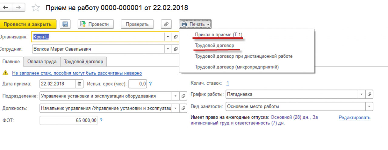 В результате этих действий сотрудника приняли на работу, а кадровые документы сформировали и заполнили корректно.