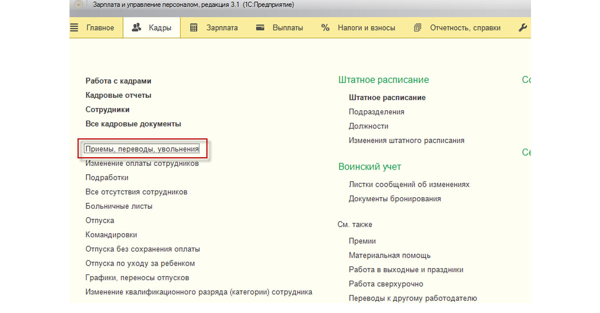 Сформированный приказ о приеме на работу можно увидеть в журнале «Кадры-Приемы, переводы, увольнения».