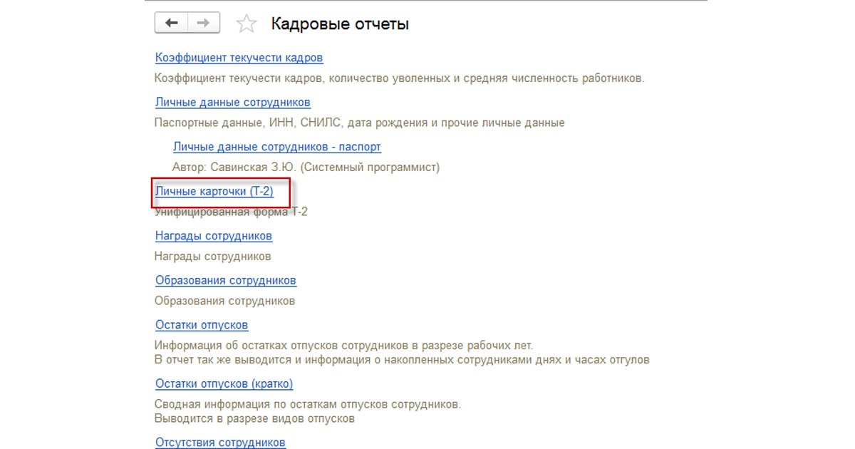 Посмотреть карточку Т-2 или распечатать ее можно войдя во вкладку «Кадры-Кадровые отчеты», затем выбрать Личные карточки Т-2, и нажать «Сформировать».