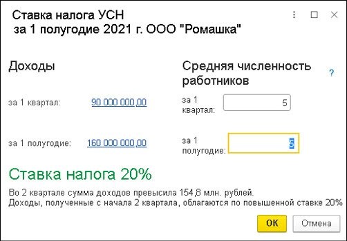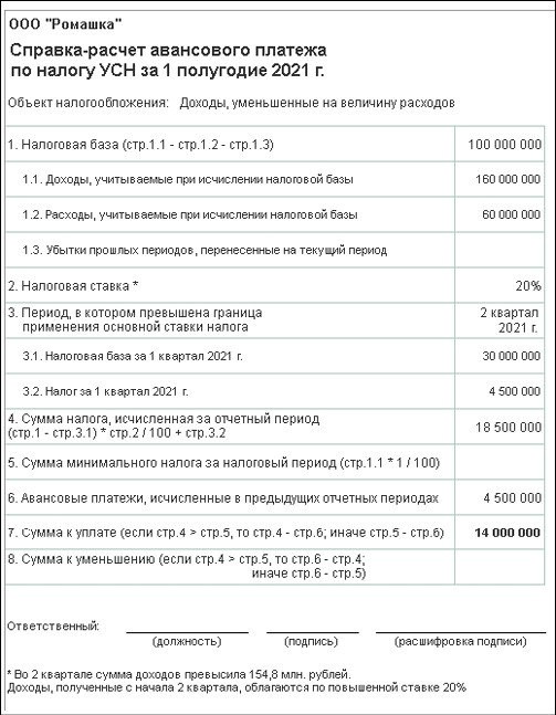 ОАО "Ромашка" использует УСН, в качестве объекта используются "доходы минус расходы". За первый квартал 2021 г. доход был равен 90 млн. руб., а расход - 60 млн. руб. За второй квартал 2021 г. выручка была 70 млн. руб., расходы отсутствовали. Численность зарегистрированного персонала - не более 100 человек.