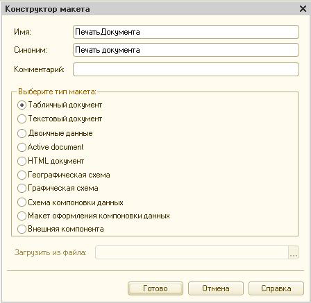 В открытом диалоговом окне нужно будет придумать и ввести имя документа и его синоним. Автоматически система сделает синоним таким же, как и имя, но вы можете поменять его на другой при желании. В данном случае мы выберем тип макета «Табличный документ». После того, как вы нажмёте «Готово», возникнет окно, напоминающее обычный лист в Excel.