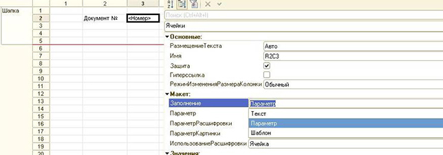 Далее следует объяснить 1С, что «Номер» - это переменная. Заходим в контекстное меню на данную ячейку и щелкаем на «Свойства». В развернувшейся палитре находим пункт «Заполнение» и выбираем для него значение «Параметр». Теперь в макете по бокам от слова появились угловые скобки - признак параметра.