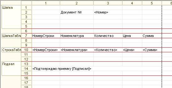 Таким образом мы дали платформе понять, о какой области идет речь при обращении по указанному имени. Теперь добавим в область для вывода конкретных данных переменные, к примеру, «Документ№» и «Номер». Пока что это просто текст, который можно только вывести на экран без изменений.