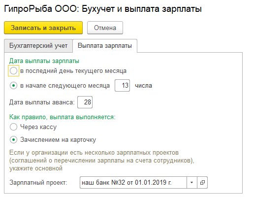 Чтобы отразить условия для выплаты зарплаты в организации, нужно правильно заполнить карточку «Выплата зарплаты». Там указываются точные числа для обоих начислений, вариант передачи денег, а также банк-партнер, через который происходит перевод.