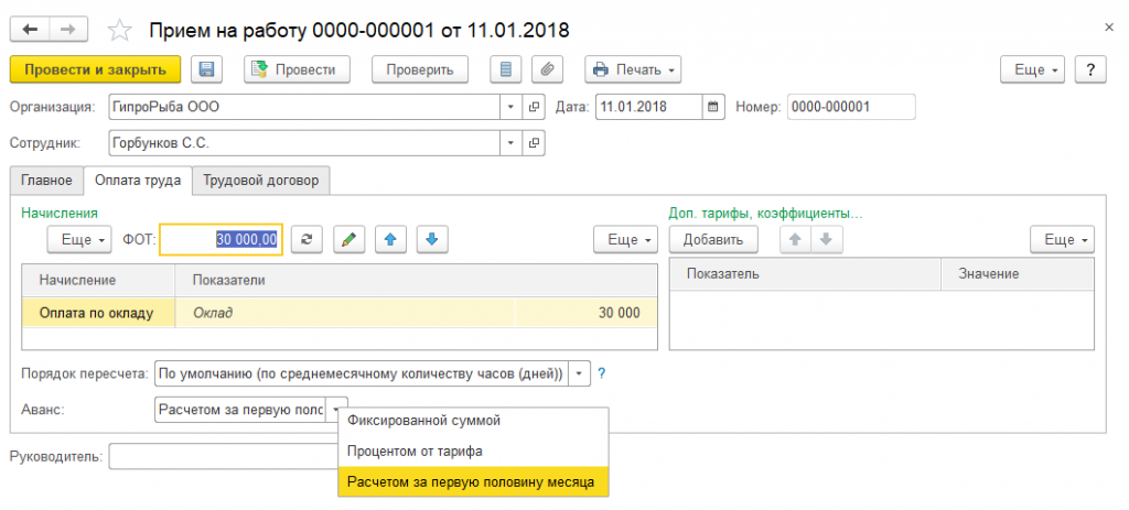 Благодаря таким исходным данным 1С получил возможность предусмотреть в программе следующие способы выплаты аванса: