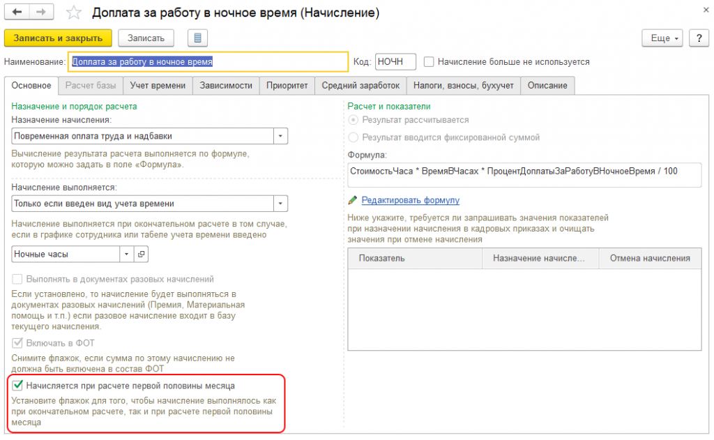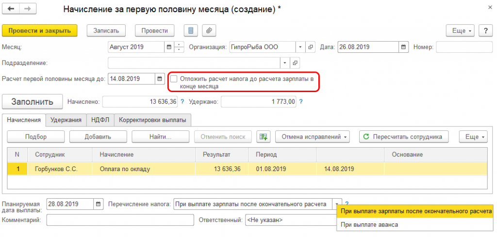 Но не стоит забывать о следующем. Если выбрано начисление за первые полмесяца, то нужно определиться с фактическим расчетом по налогу. В соответствующей карточке в программе нужно обратить внимание пункты. позволяющие перенести расчет на зарплату в конце месяца. На рисунке показано, где находятся эти графы.
