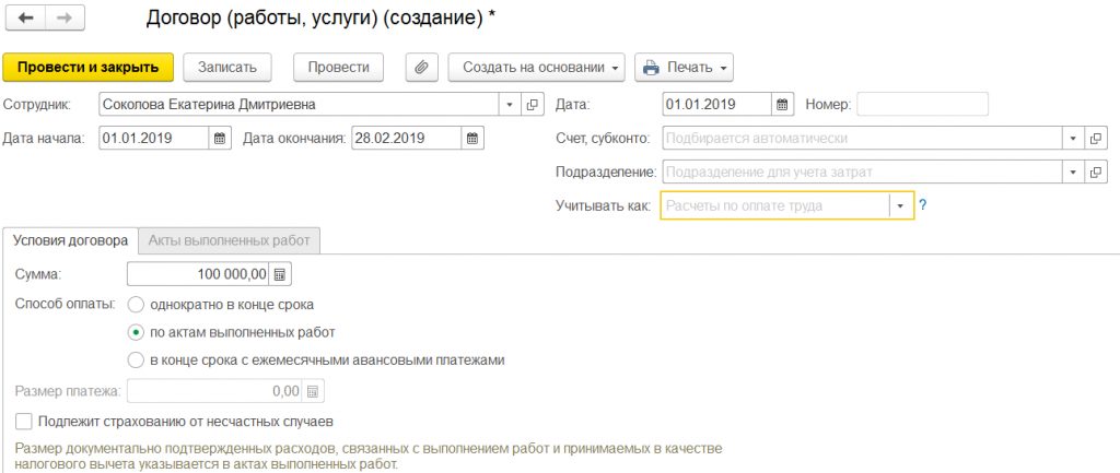 Заполняем период действия договора. Вводим сумму договора и выбираем способ выплаты. Возможны три варианта: единовременно по окончанию договора, по актам выполненных работ и по окончанию договора с авансовыми платежами каждый месяц.