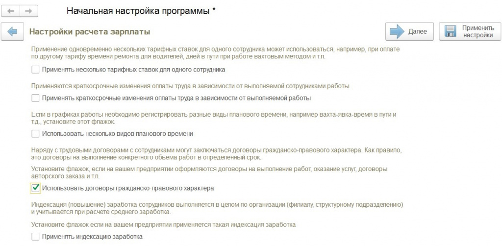 Если вы уже давно работаете в программе и не сможете зайти в помощник начальной настройки, не расстраивайтесь, можно открыть меню «Настройка», перейти в «Расчет зарплаты» и поставить галку «Регистрируются выплаты по договорам ГПХ».