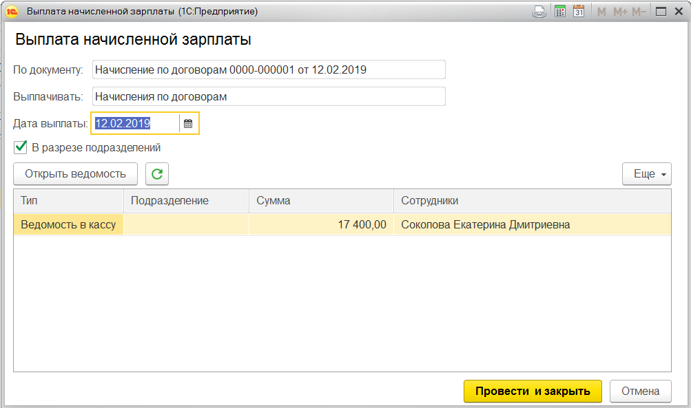 Ведомость будет с видом «начисления по договорам».