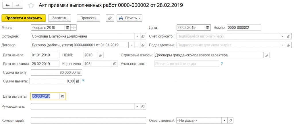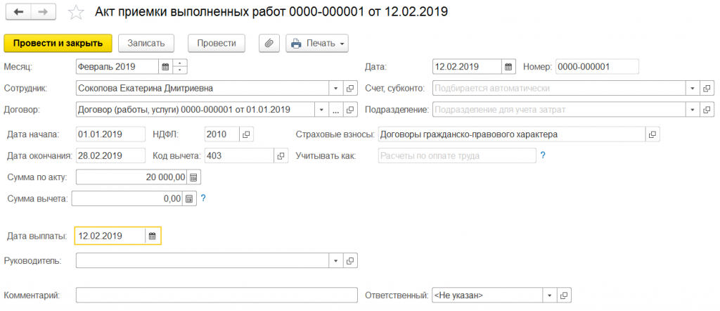 На основании договора подряда мы можем создать акт выполненных работ. Заведем два акта. Первый акт от 12 февраля 2019 на сумму 20 000 рублей. Дата выплаты 12 февраля. Месяц начисления февраль 2019.